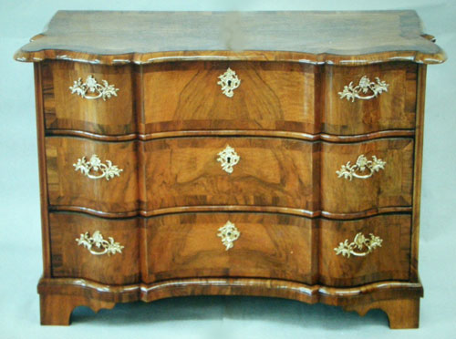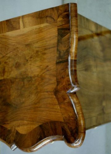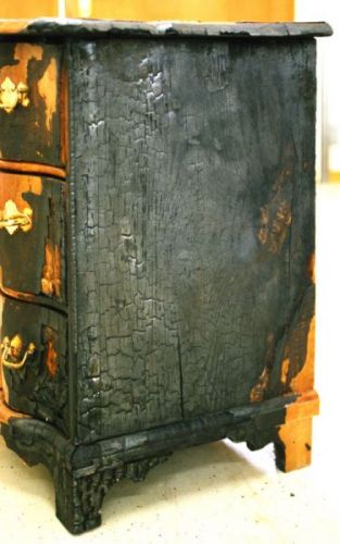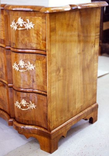 Die Barockkommode ist durch einen Brand und Löschwasser stark geschädigt worden. Der Brand zerstörte auf der rechten Seite das Nussbaumfurnier und das darunter liegende Nadelholz (Blindholz) nahezu vollständig, sodass eine Rekonstruktion erforderlich wurde (Abbildung 3). Die neue Holzoberfläche wurde durch Bleichen und anschließendes Beizen dem natürlich gealterten Furnieroberfläche in seiner Farbe angepasst.