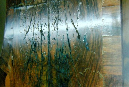 Gelöste Tinte drang durch geschädigten Lack in die Holzaberfläche ein und verursachte auf der Deckplatte eine Verfärbung des Furnieres (Abbildung 5).