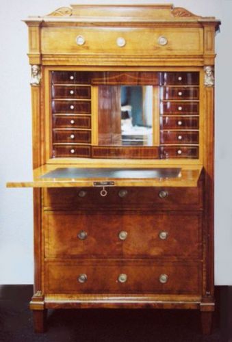 Die Abbildung zeigt den Standsekretär aus dem frühen Biedermeier im geöffneten Zustand nach der Restaurierung. Das Schreibmöbel wies deutliche Gebrauchsspuren an der furnierten Möbeloberfläche auf. Die Schubkästen ließen sich durch die abgenutzten Laufleisten nur schwer öffnen. Die Furniere waren an den Kanten gelöst oder durch unsachgemässen Gebrauch abgeplatzt. Sowohl am Giebel als auch am Sockel des Sekretärs fehlten die Holzprofile mit Messingummantelung.