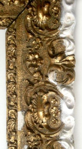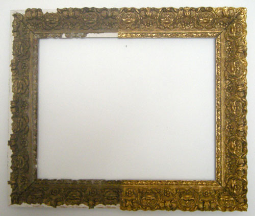Die Abbildung 1 zeigt einen vergoldeten Gemälderahmen, der zu Anschauungszwecken zur Hälfte restauriert wurde. Es handelte sich ursprünglich um einen stark zerstörten vergoldeten Ornamentrahmen mit einer goldfarbenen Übermalung (linke Seite des Rahmens).