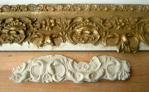 Die Übermalung des Rahmens konnte abgenommen und die darunterliegende Blattgoldauflage wieder freigelegt werden. Die Ornamente des Rahmens waren am Rand größtenteils abgestoßen, sodass eine Rekonstruktion der fehlenden Teile notwendig wurde. Mit Hilfe von noch vorhandenen Ornamentresten konnten Negativfomen hergestellt und die fehlenden Ornamente mit Kittmasse rekonstruiert werden (Abbildung 2). Die fertigen Nachgüsse wurden anschließend an die Bruchkanten angepasst (Abbildung 3), mit einem Polimentauftrag versehen und zum Abschluss neu vergoldet.